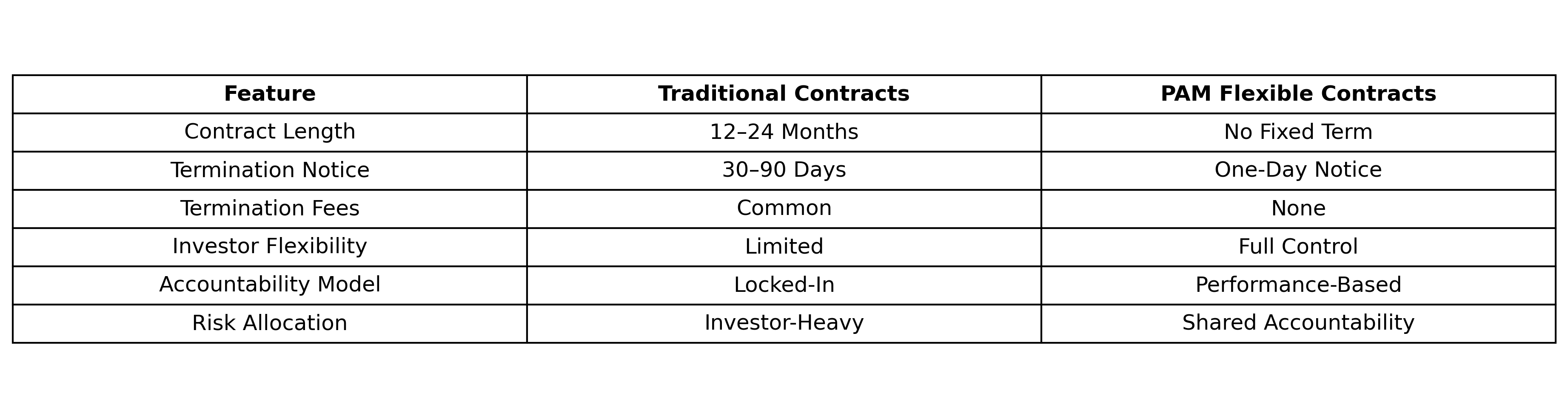 View this table to better understand traditional property contracts versus those offered by PAM:
