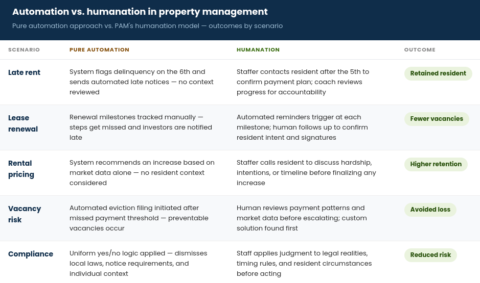 For investors considering a property manager, this article covers what humanation means, how it solves common leasing and rent collection problems, and why pure automation isn't enough to protect your returns.